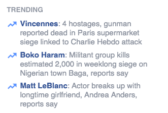 Posted on 9 Jan 20159 Jan 2015 by Trent WilkieWe are crummy opulence The saddest thing about Facebook is how, sometimes, it reflects back on our Western lives the utter shallowness of what we encapsulate. Death, death and then celebrity break up. Welcome to shitty now. Facebook Trending 01/09/2015 SHARE!TweetShare on Tumblr Click to email a link to a friend (Opens in new window) Email Click to share on Reddit (Opens in new window) Reddit Like Loading...